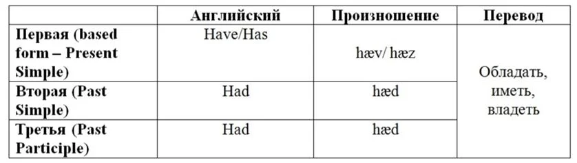 Существуют 3 формы неправильного глагола to have в английском языке – первая (настоящее время), вторая (простое прошедшее время) и третья (причастие прошедшего времени).