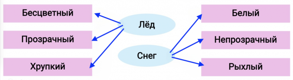 В каком столбике описаны свойства снега, а в каком — льда? Укажи стрелками.