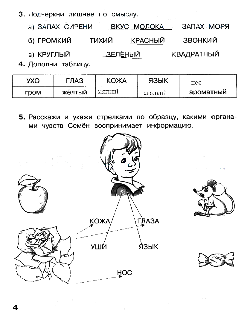 а) ЗАПАХ СЕРЕНИ ВКУС МОЛОКА ЗАПАХ МОРЯ (так как запахи мы ощущаем с помощью носа, а вкус с помощью языка, разные органы чувств) б) ГРОМКИЙ ТИХИЙ КРАСНЫЙ ЗВОНКИЙ (все, кроме красного — это характеристика звука, эту информацию мы получаем с помощью уха, а красный цвет с помощью глаз) в) КРУГЛЫЙ ЗЕЛЁНЫЙ КВАДРАТНЫЙ (все кроме зеленого является характеристикой формы предмета, а зеленый — это цвет. Форму предмета мы можем не только увидеть, но пощупать закрытыми глазами, то есть получить информацию с помощью кожи. А цвет можем увидеть только глазами) 4. Дополни таблицу.