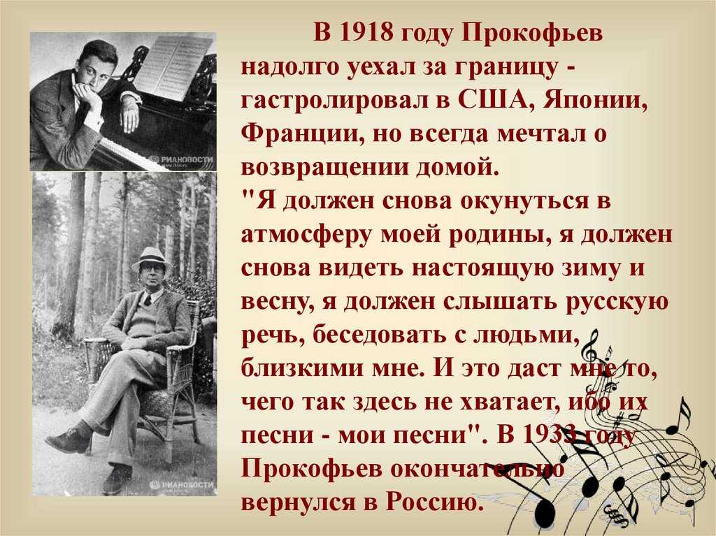 Прокофьев ( Прокофьев в системе транслитерации РАН) родился в семье земледельцев. Деревенская жизнь с ее крестьянскими песнями оставила в нем неизгладимый отпечаток. Мать, хорошая пианистка, стала для высокоодаренного ребенка первым музыкальным наставником и устраивала поездки в оперу в Москву. Талант мальчика высоко оценил московский композитор и педагог Сергей Танеев, по рекомендации которого русский композитор Рейнгольд Глиэр дважды ездил в летние месяцы в Сонцовку, чтобы стать первым учителем юного Сергея по теории и композиции и подготовить его к вход в консерваторию в Санкт-Петербурге. Годы, проведенные Прокофьевым в этом учреждении — 19 лет.с 04 по 1914 год — период бурного творческого роста. Учителя были поражены его оригинальностью, и когда он закончил учебу, он был удостоен премии Антона Рубинштейна по классу фортепиано за блестящее исполнение своего первого масштабного произведения — Концерта № 1 для фортепиано с оркестром ре-бемоль мажор № .